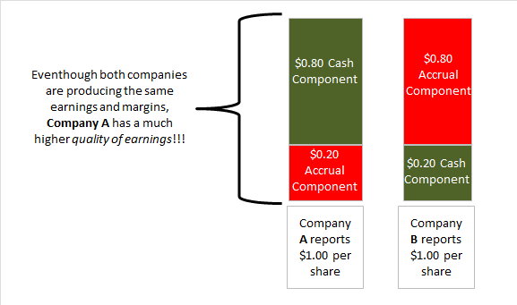 Suppose we had two companies, Company A and Company B. Both are expected to earn $1.00 per share on $10mm in revenues. One would think them identical but that may not be the case. One needs to analyze the quality of earnings to get a clearer picture. Let’s suppose the “cash” component of company A is $0.80 and the “accrual” portion is $0.20. This means that of the $1.00 in earnings that is reported by company A, $0.80 is accounted for and collected as reflected on the cash flow statement and $0.20 is reported but not yet collected.